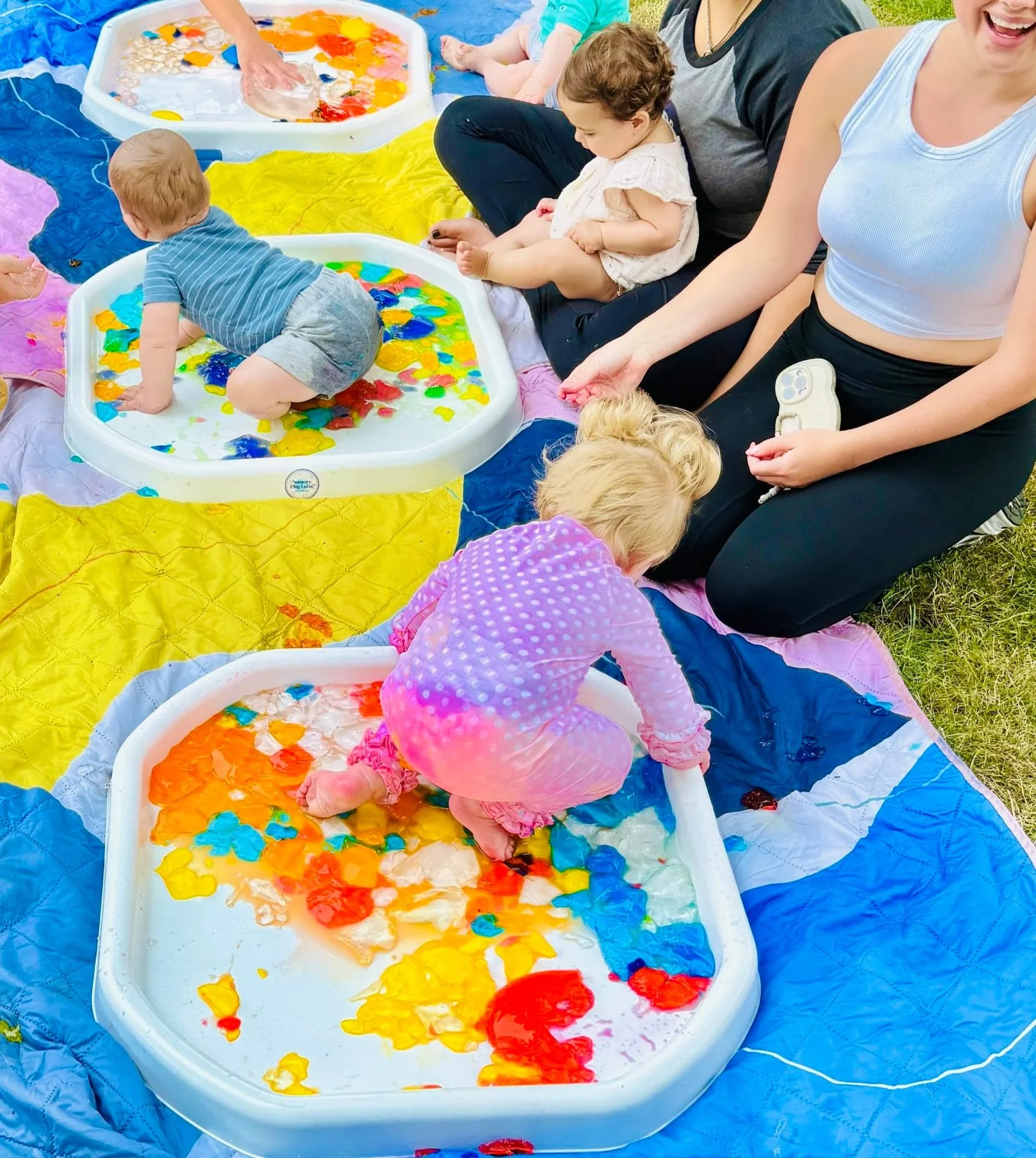 Photo worthy activities with brightly colored, messy play stations featuring baby safe, mouthing friendly messy materials! Choose from fully edible activities like finding baby safe treasures of piles on neon rainbow spaghetti, splashy water play, things to squish like polka dot “Jello” (*not meat based, no sugar) and other messy play fun to crawl and climb through!