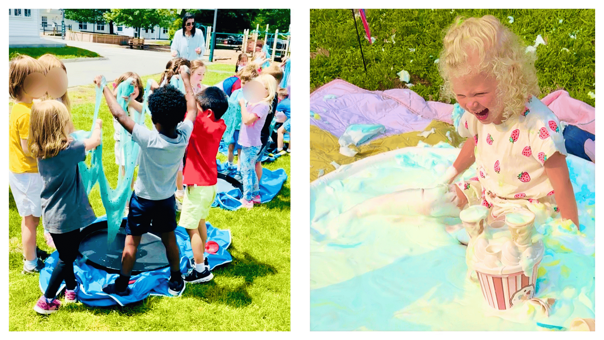Extra Messy Stations use show stopping, brightly colored wet materials that will cover hands, arms and faces! Edible Crawl Through Painting, Taste-safe Orange Lava and foamy, splashy play too. Materials that may leave hands a little colorful.