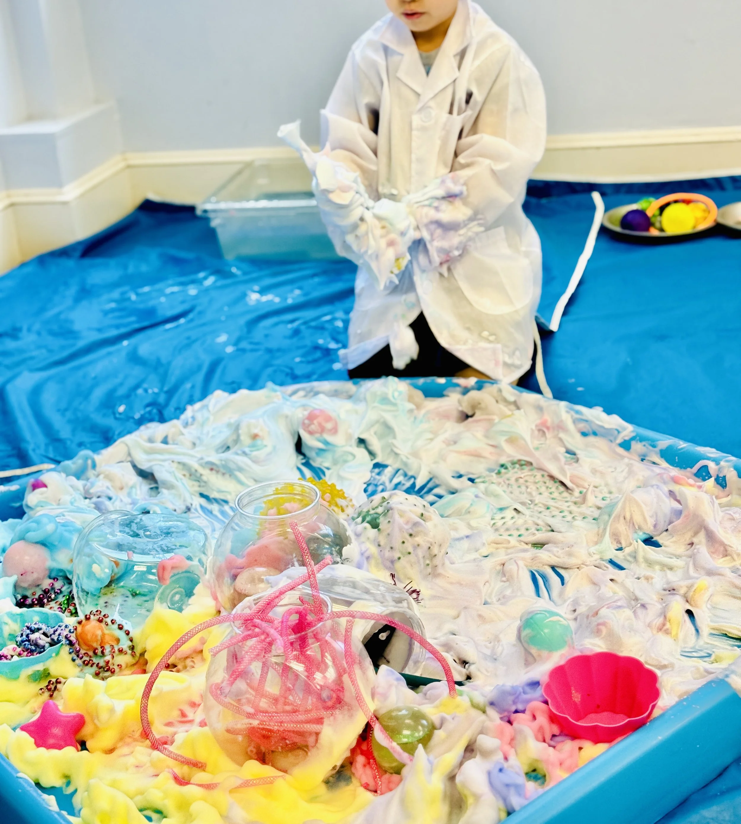 Included: A Sensory Play Labs visit or session designed just for your center and clients. On-site setup and cleanup. (No mess left behind.) Off Site cleanup of all messy tools, stations, smocks and all other messy things. A sensory friendly variety of clean smocks and mini lab coats provided each week along with wipes and paper towels.